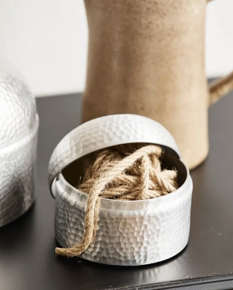 Het Nordal Macau voorraadpotje met aluminium deksel. De Macau voorraad pot heeft een gehamerd oppervlak dat contrasteert met andere gladde oppervlakken om je interieur een exclusief tintje te geven. Afmeting Ø10×8,5cm