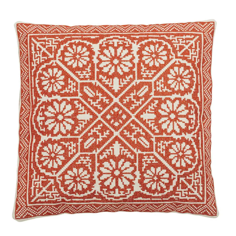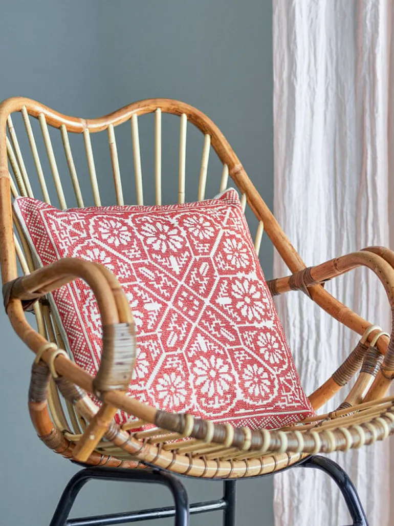 Het Bloomingville Madita kussen heeft een traditioneel patroon in warme rode en natuurlijke witte kleuren. Het kussen is ontworpen met symmetrische patronen en gedetailleerde bloemmotieven. Afmeting 40x40cm