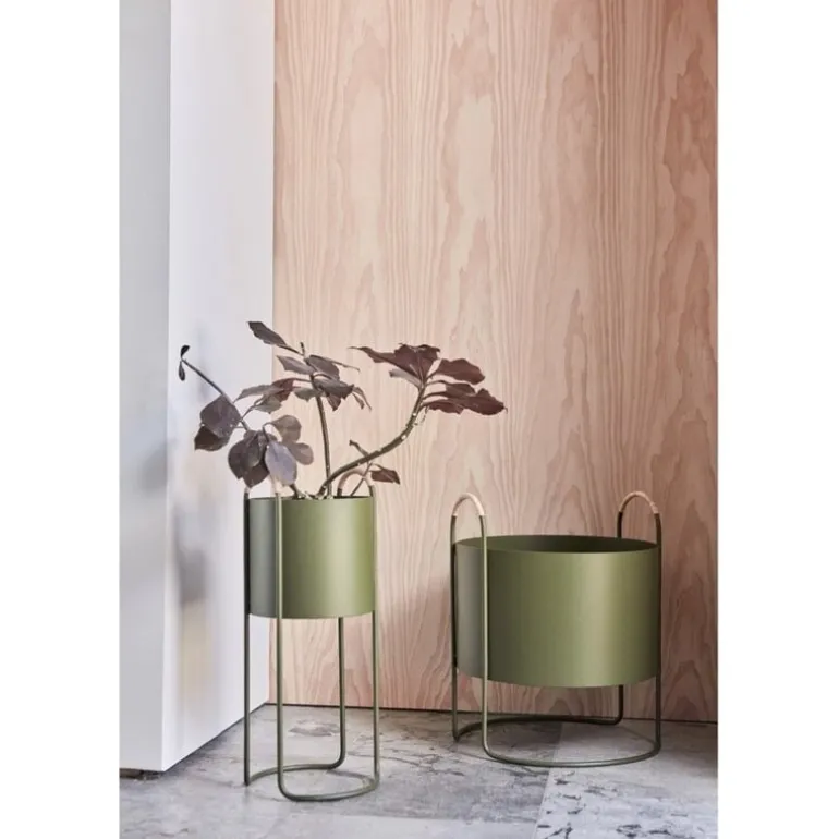 Metalen plantenbak met rotan details aan beide handvaten. De OYOY Maki plantenbak is beschikbaar in twee afmetingen en verschillende kleuren. Afmeting 24x22x55cm