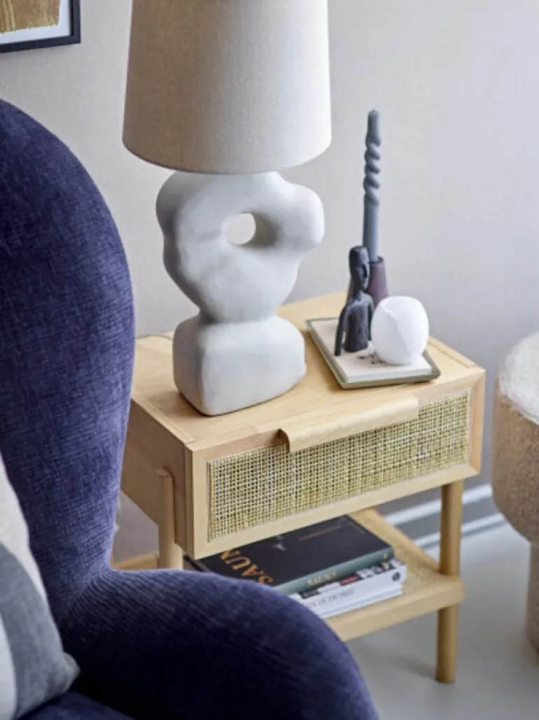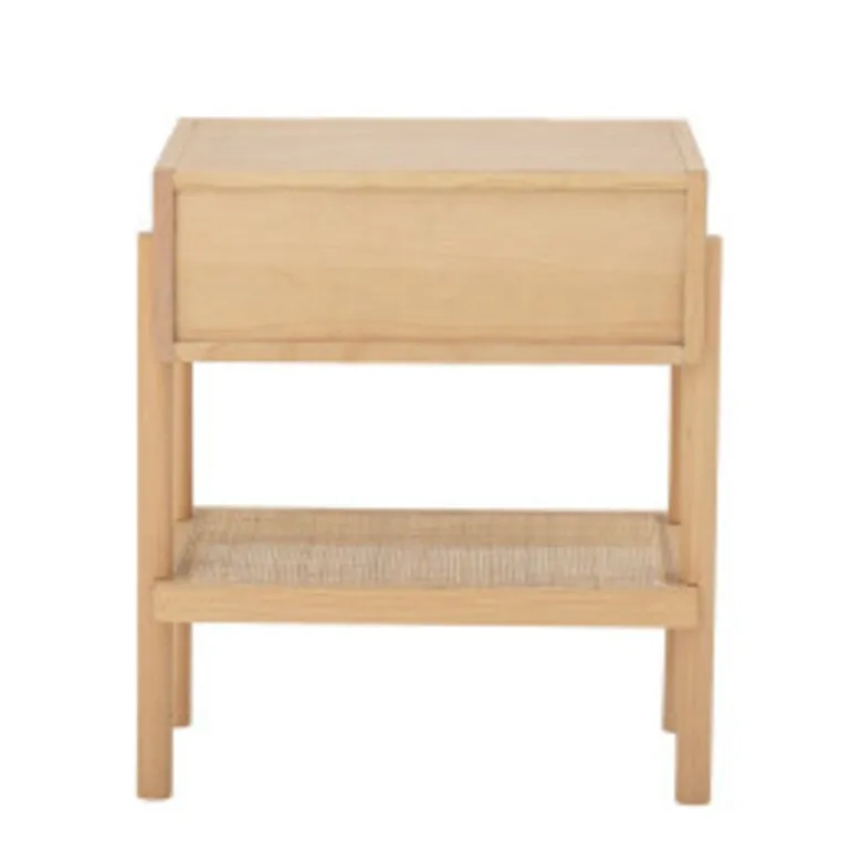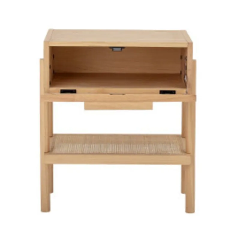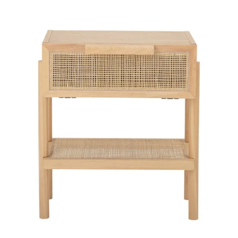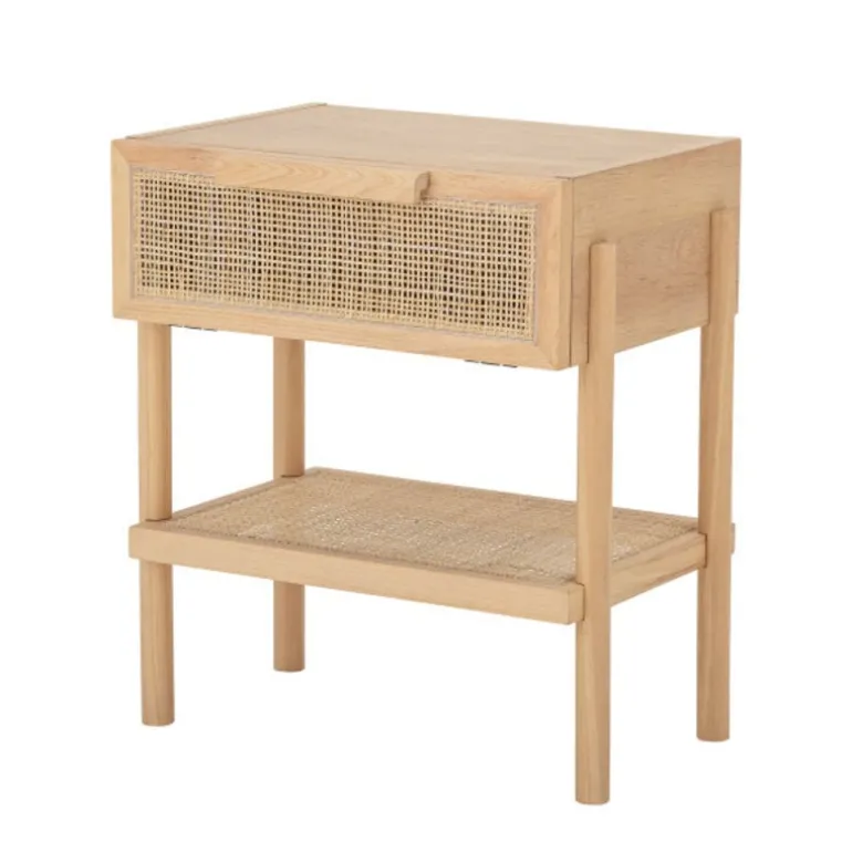 Mooie bijzettafel met een vak op spulletjes op te bergen, Staat prachtig in de woonkamer maar ook te gebruiken als nachtkastje. De Bloomingville Manon bijzettafel is gemaakt van mdf fineer, hout en rotan. Afmeting L49xH54xW35,66 cm