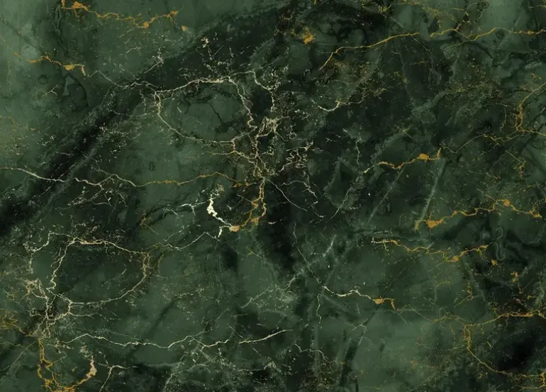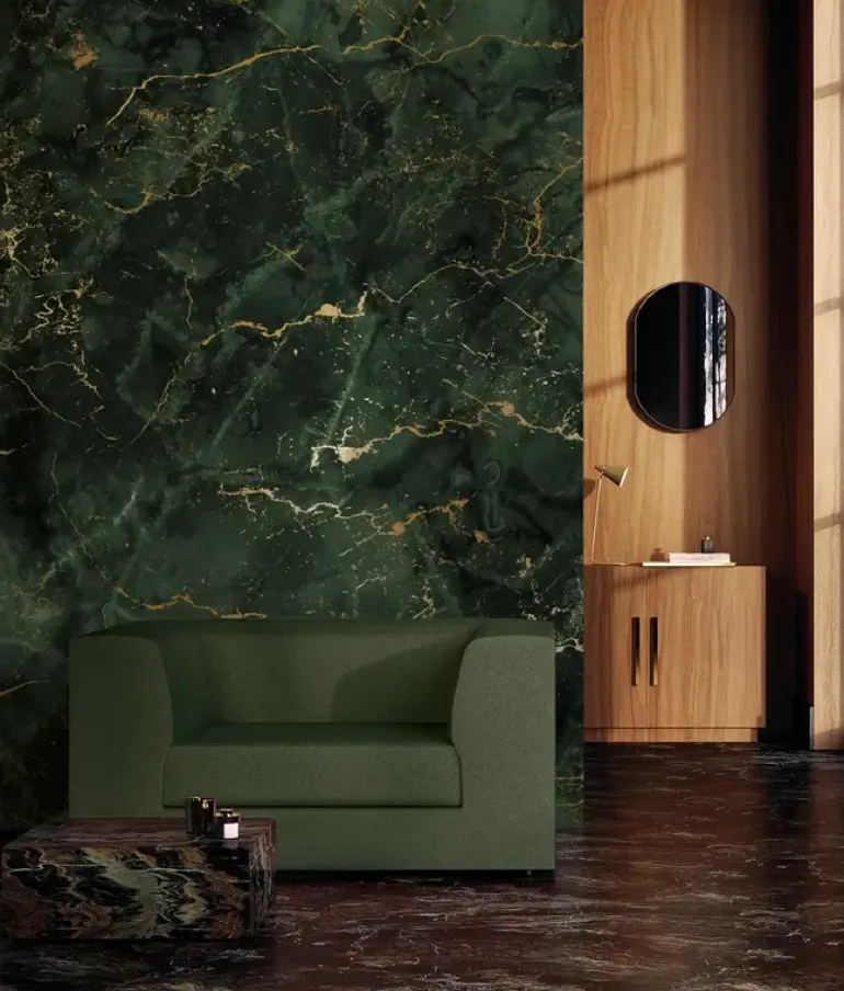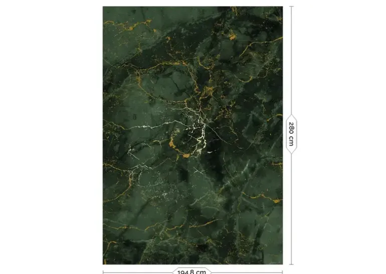 Frans Uyterlinde x KEK Amsterdam. Elegant marmerbehang met gouden accenten in hoogglans. Het KEK Amsterdam Marmer behangbehang heeft een afmeting van 194,8x280cm (4 banen). Beschikbaar in verschillende afmetingen.