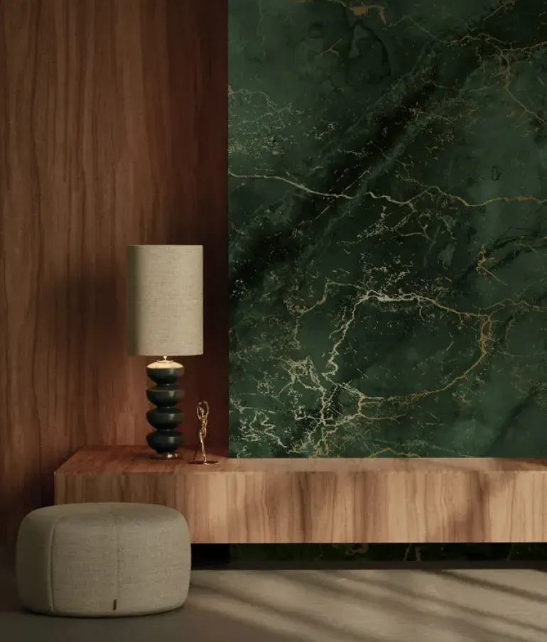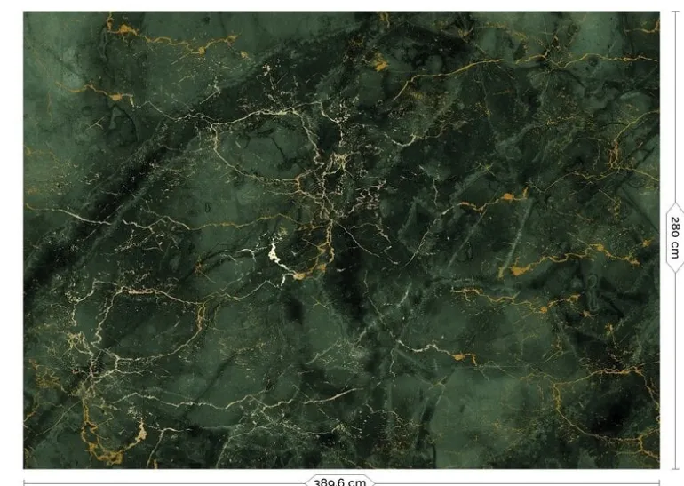 Frans Uyterlinde x KEK Amsterdam. Elegant marmerbehang met gouden accenten in hoogglans. Het KEK Amsterdam Marmer behangbehang heeft een afmeting van 389,6x280cm (8 banen). Beschikbaar in verschillende afmetingen.