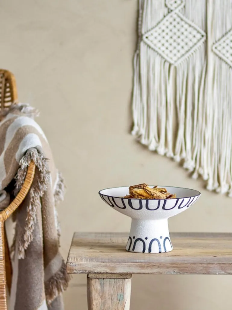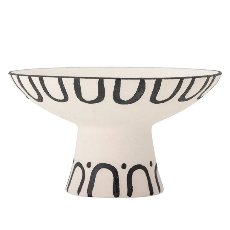 De Bloomingville Mayotte schaal is een opvallende schaal op standaard in een mat witte glazuur met een stoer grafisch handgeschilderd patroon in zwart. Het is perfect ter decoratie of gebruik het voor fruit of groenten. Afmeting Ø26x15cm