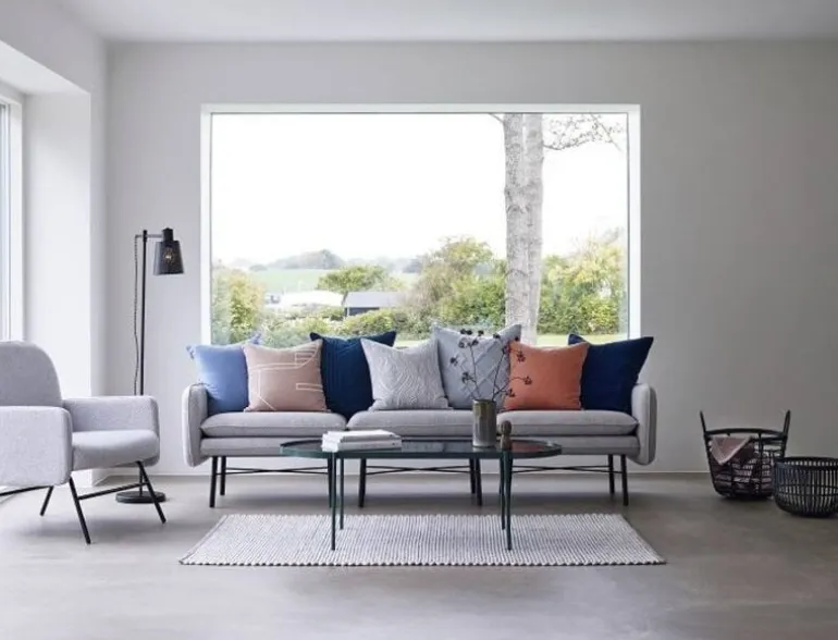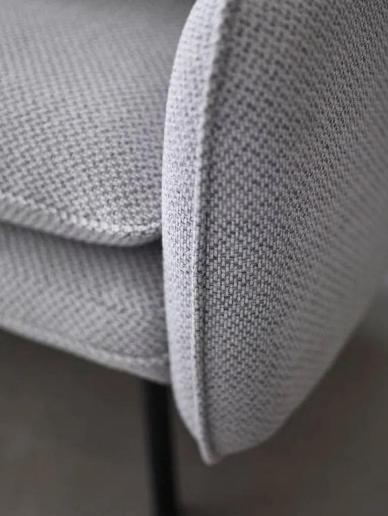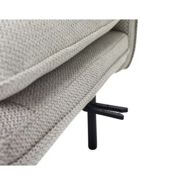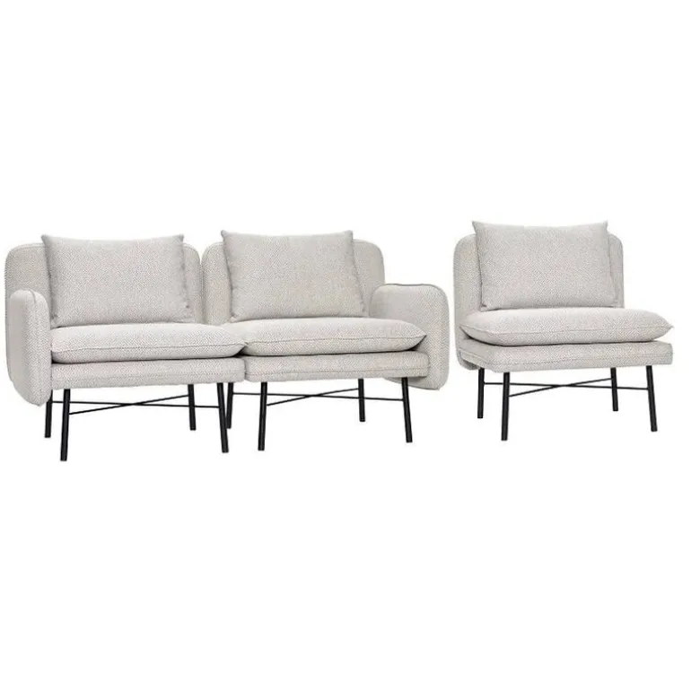 Moderne 3-zits modulaire bank van het Deense interieurmerk Hübsch. Deze Hübsch bank is gestoffeerd met een lichtgrijze stof en voorzien van zwart metaal onderstel. De elementen zijn koppelbaar doormiddel van een bevestiging onder het element.