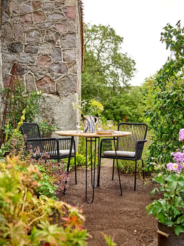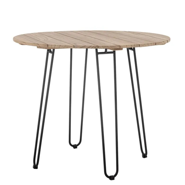 De Bloomingville Molito tafel heeft een elegant tafelblad van teakhouten latten. De zwarte metalen poten zorgen voor een modern contrast en zorgen voor stabiliteit. Te tafel kan buiten gebruikt worden. Afmeting Ø90x75cm