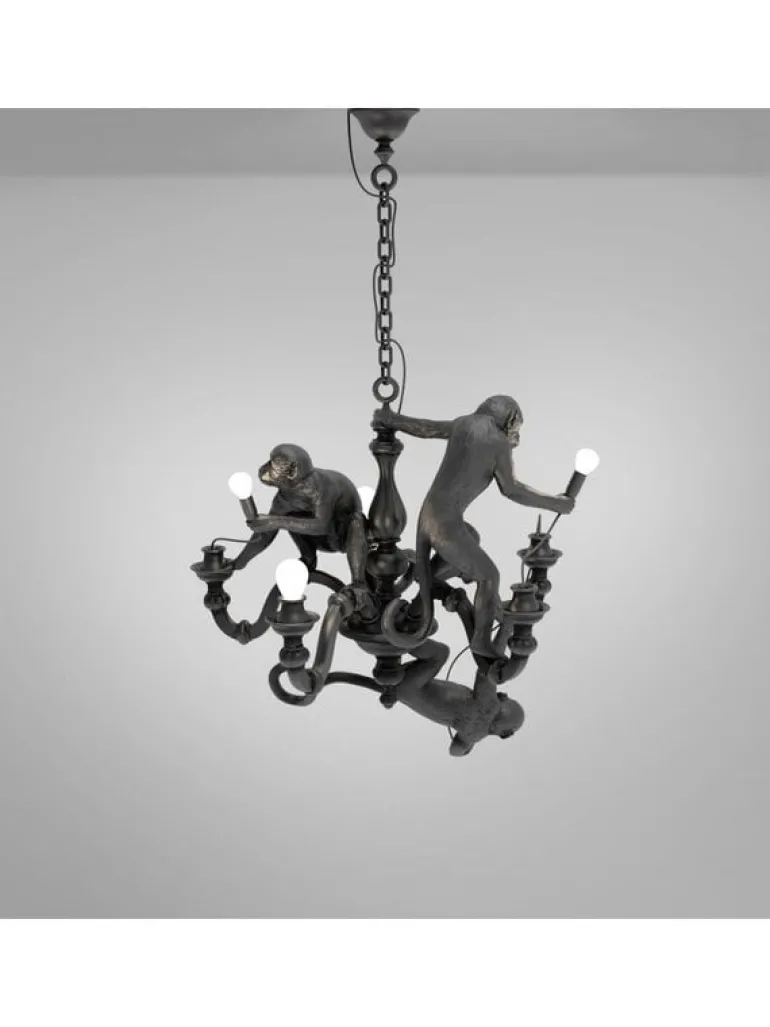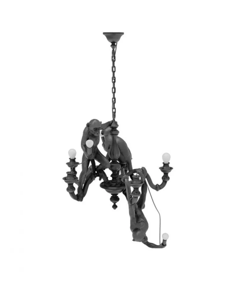 Mooie, grote kroonluchter van Seletti. De Seletti Monkey kroonluchter bestaat uit drie apen en totaal gaan er 5 LED E14 lichtbollen in. De lamp is een echte eyecatcher in de kamer! Afmeting 80x80cm, hoogte 105cm. Beschikbaar in twee kleuren.