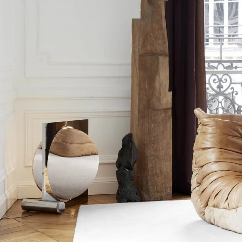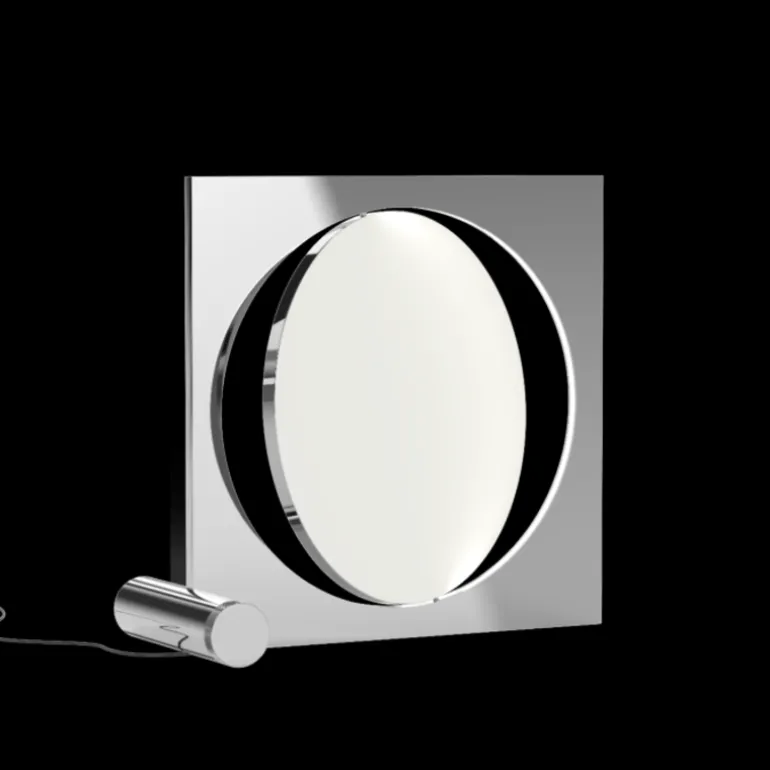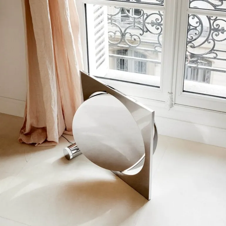 De Louis Poulsen Moonsetter vloerlamp heeft een roterende schijf waarmee de terugkaatsing van het licht kan worden aangepast. De schijf kan 360° om zijn eigen as heen draaien en is aan de ene kant wit en aan de andere kant verchroomd. 30x60x64cm