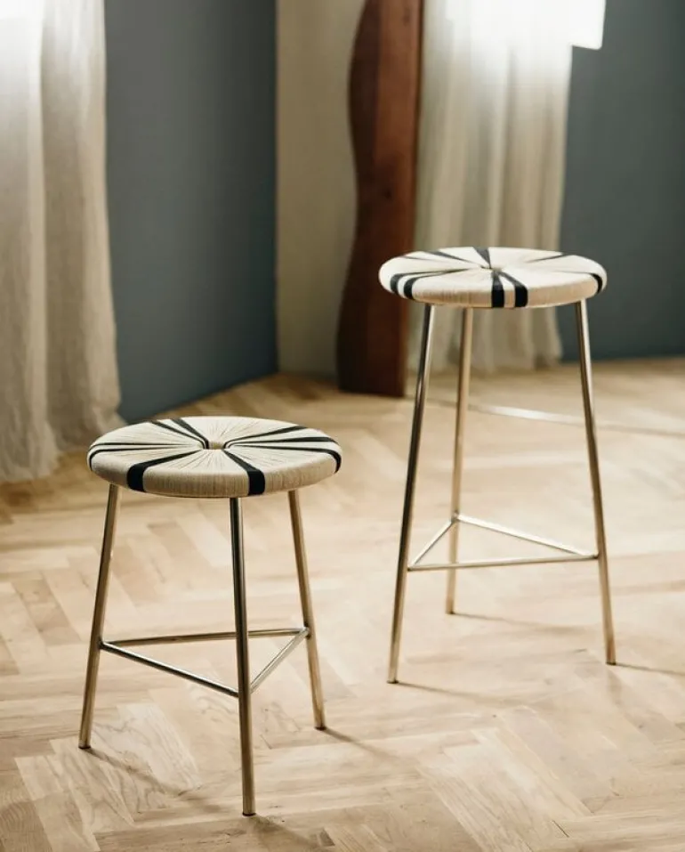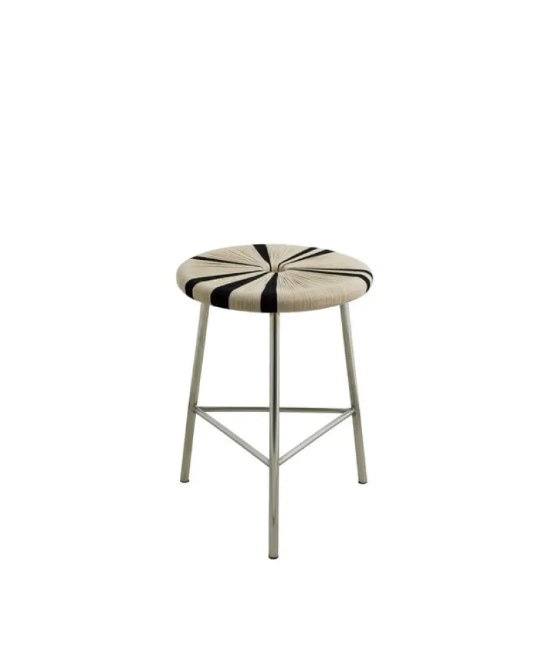 De Nordal Morice kruk is beschikbaar in een hoge en lage versie. De kruk heeft een chromen frame en handgeweven gestreepte zitting van jute. De perfecte balans tussen ruw, elegant en modern design. Afmeting Ø40x53cm