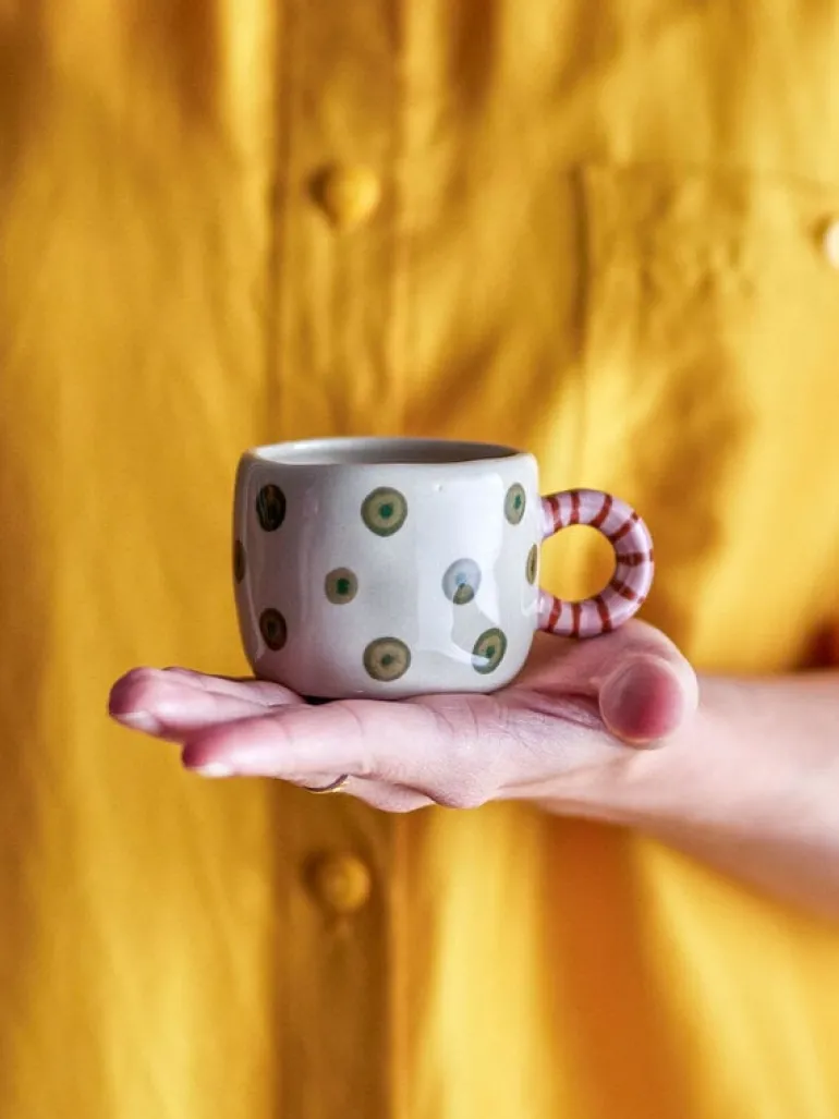 De Bloomingville Nini mokken worden geleverd in een set van 6 stuks. De kleine kopjes hebben een stipjes patroon. Leuk om te combineren met de andere Nini mokken. Afmeting Ø6,5x5cm