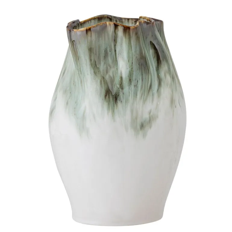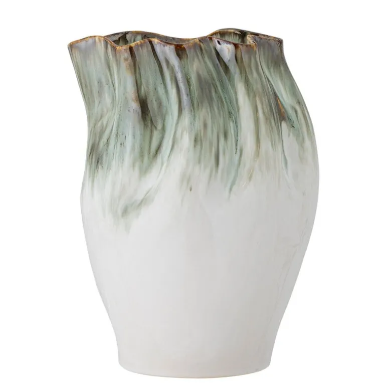De Bloomingville Nisha vaas heeft een glazuur die een prachtig vloeiend effect creëert. De glazuurkleuren in groene tinten vallen elegant naar beneden en mengen zich met de lichte basis van de vaas om een opvallend contrast te creëren. Afmeting Ø22,5×30
