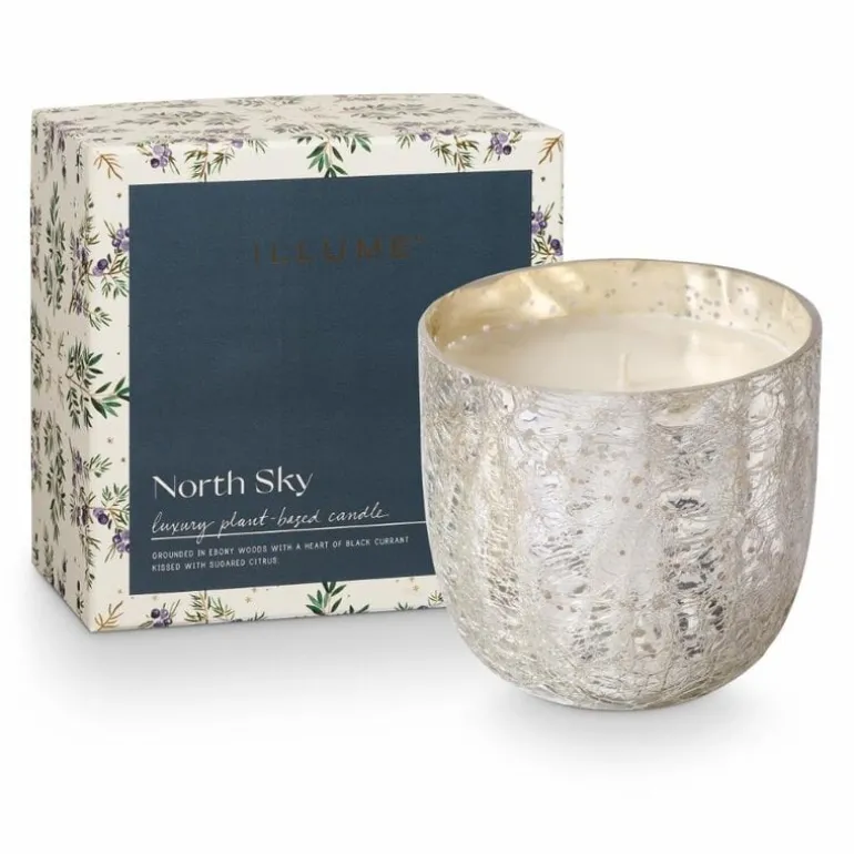 De Illume North sky crackle kaars met de geur van ebbenhout met een hart van zwarte bessen, gekust door gesuikerde citrusvruchten. Vegan, dierproefvrij, plantaardig. Brandduur is tot 80 uur. Afmeting Ø12×11,5cm