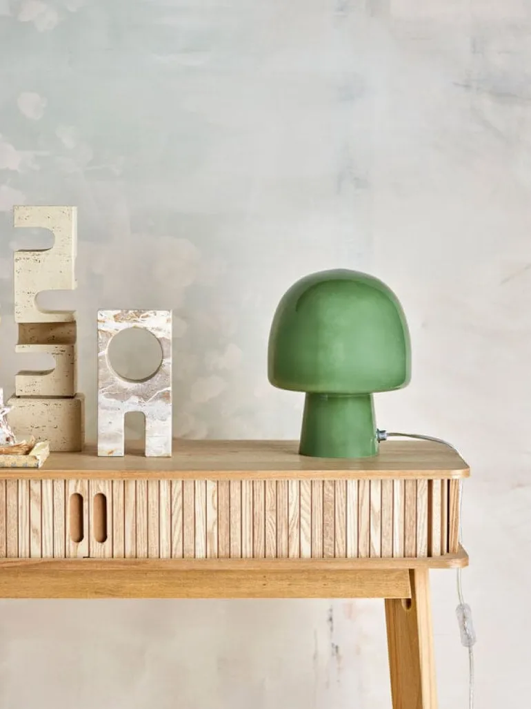 De Bloomingville Paddy tafellamp is gemaakt van groen glas met een rond, op een paddenstoel geïnspireerd silhouet. De lamp geeft zeer sfeervol licht. Afmeting Ø20×26,5cm