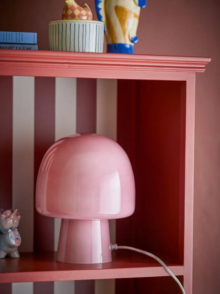 De Bloomingville Paddy tafellamp is gemaakt van roze glas met een rond, op een paddenstoel geïnspireerd silhouet. De lamp geeft zeer sfeervol licht. Afmeting Ø20×26,5cm