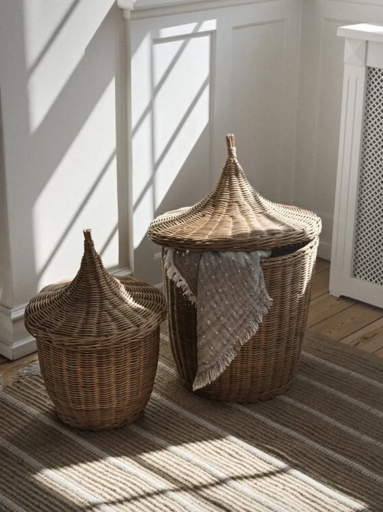 Set van 2 rotan manden waarbij elke mand een andere afmeting heeft. De Broste Copenhagen Pallas manden zijn ideaal om spullen op te bergen. De opbergmanden hebben een deksel.