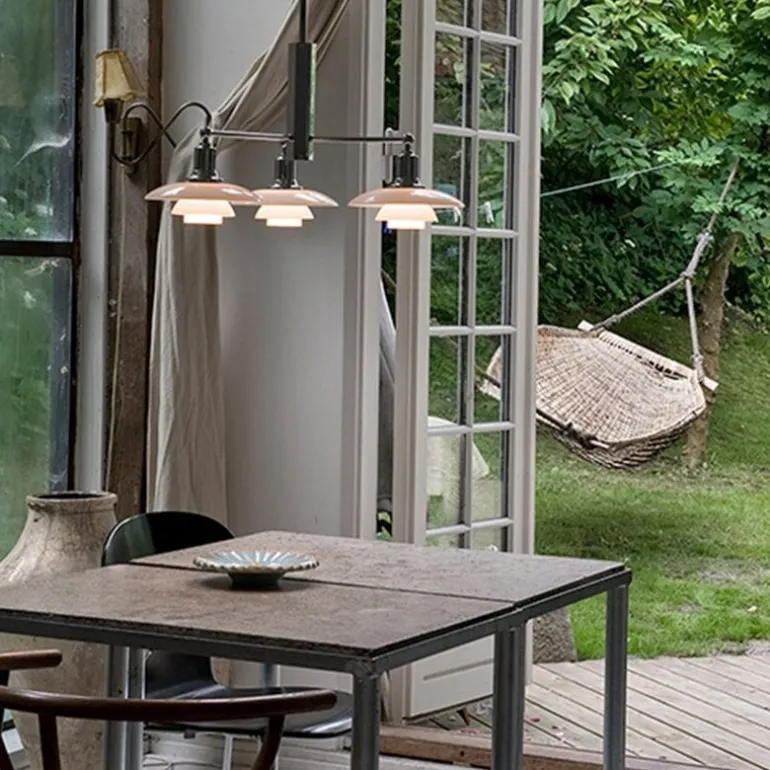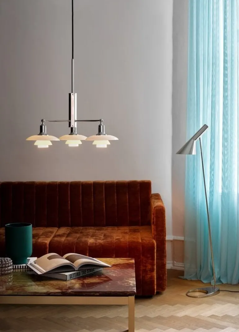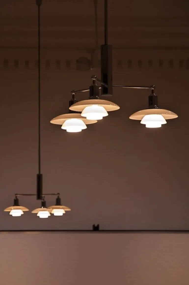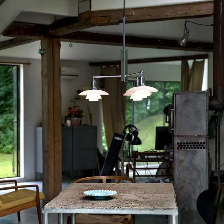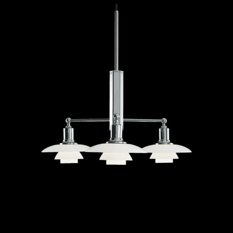 De Louis Poulsen PH 2/1 stem fitting hanglamp is ontworpen volgens het reflecterende drie schermen systeem. Gemaakt van mondgeblazen opaalglas, hoogglans verchroomd messing en aluminium. Afmeting 59,6×55,1×59,6cm
