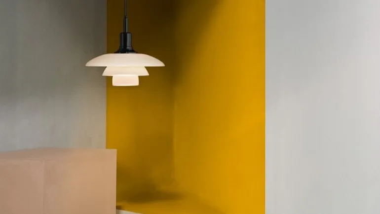 De Louis Poulsen PH 3½-3 hanglamp is ontworpen volgens het reflecterende drie schermen systeem. Gemaakt van mondgeblazen opaal glas waarvan de bovenzijde glanzend is en de onderzijde gezandstraald. Afmeting 33×30,7x33cm