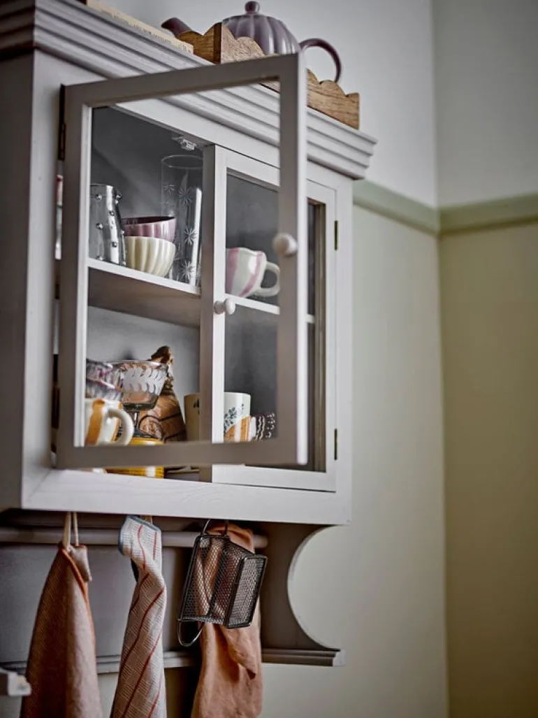 De Bloomingville Pilu wandkast is een stijlvolle kast die display en opbergruimte combineert. Dankzij de elegante glazen deuren kunt u gemakkelijk uw favoriete items tentoonstellen en in je interieur integreren. Afmeting 65x70x20cm