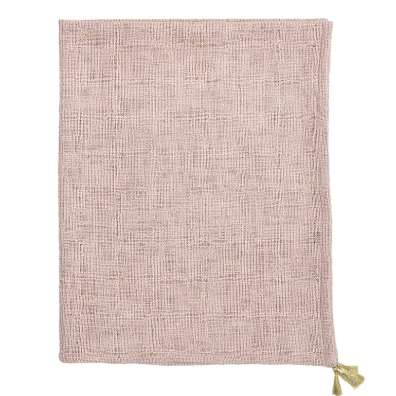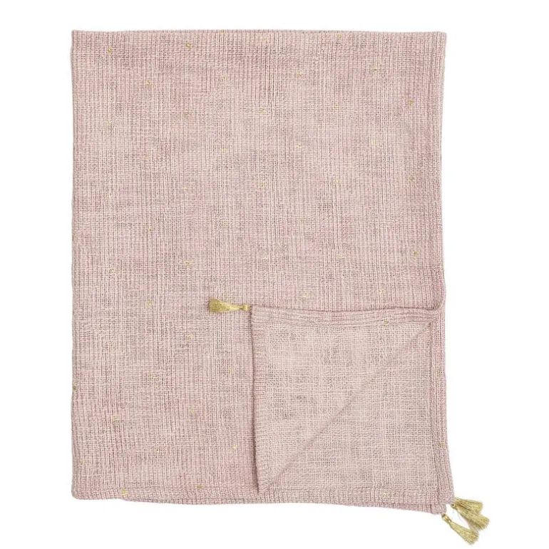 Mooi groot plaid van het prachtige merk Bloomingville Mini. Dit roze Bloomingville Mini plaid is gemaakt van 100% katoen en heeft gouden details. Afmeting L100xW80 cm