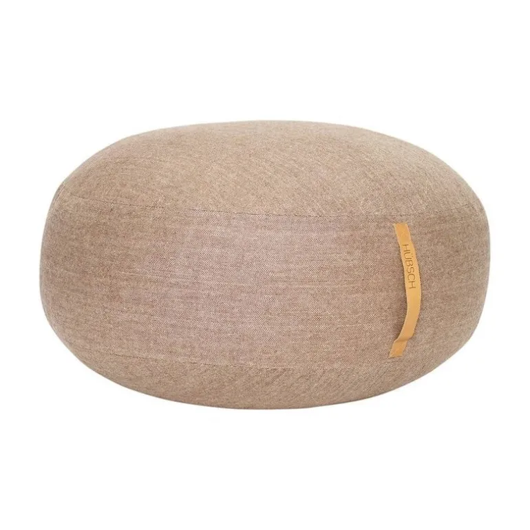 Moderne poef van het Deense woonmerk Hübsch. Deze Hübsch poef is gestoffeerd in een bruine wollen stof en heeft een leren handvat. Hoe combineer jij deze beauty in je interieur?
