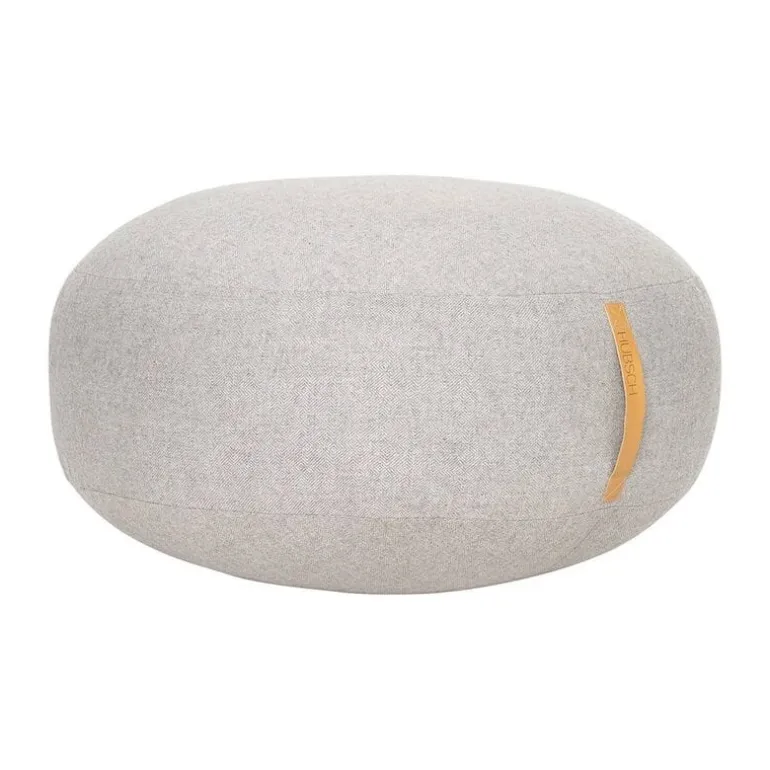 Moderne poef van het Deense woonmerk Hübsch. Deze Hübsch poef is gestoffeerd in een grijze wollen stof en heeft een leren handvat. Hoe combineer jij deze beauty in je interieur?