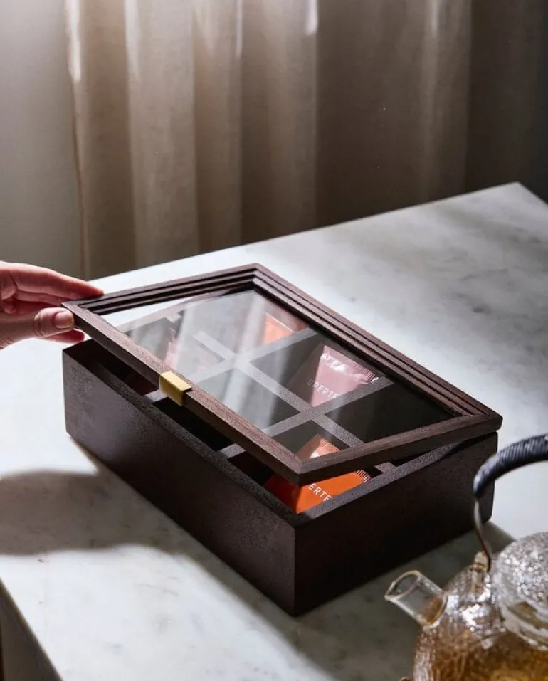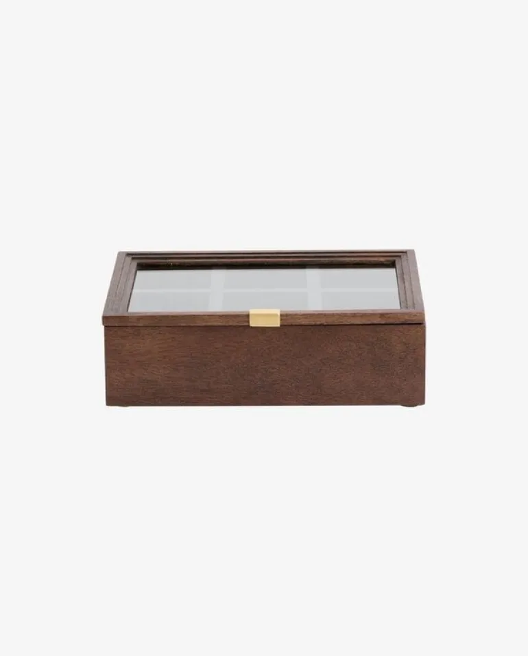 De Nordal Puyo opbergbox is gemaakt van hout en glas met een messing detail. De box is zowel decoratief als praktisch voor opslag. Handig voor theezakjes maar ook voor sieraden. Afmeting 25x23x7cm