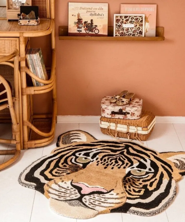 De vloerkleden van Doing Goods zijn razend populair en wij begrijpen waarom! Het Doing Goods Rajah Tiger head vloerkleed L is prachtig en wordt met veel liefde handgemaakt in India van wol. Afmeting 101x100x2cm