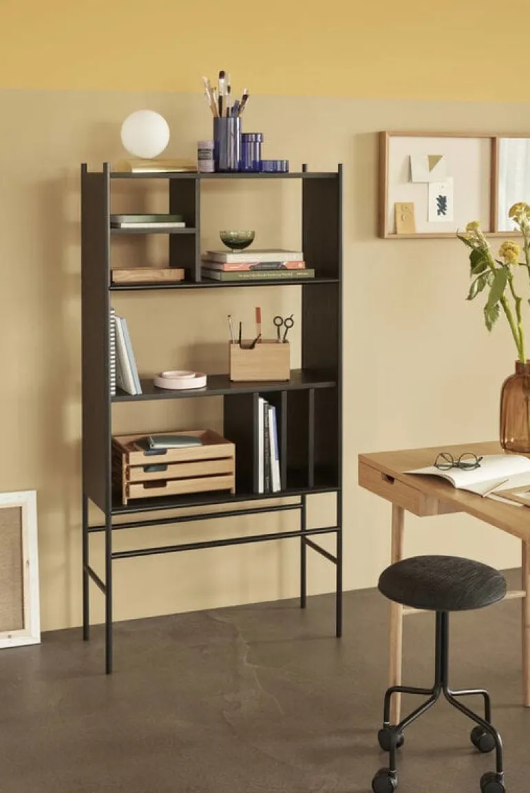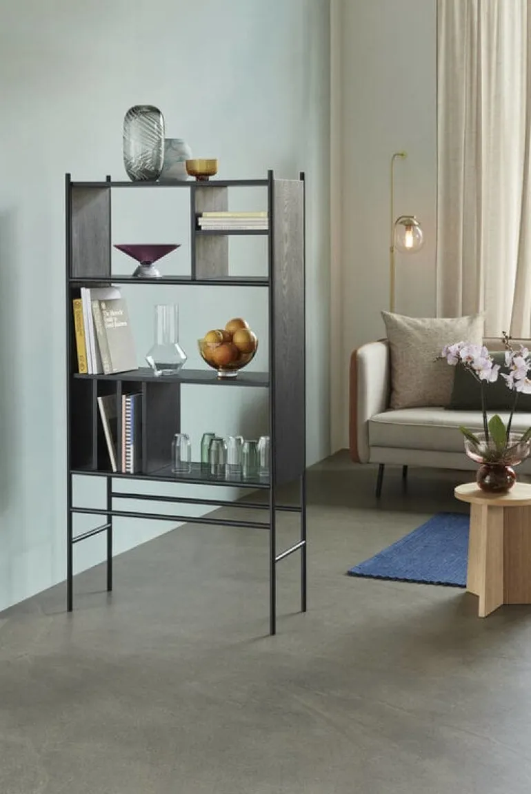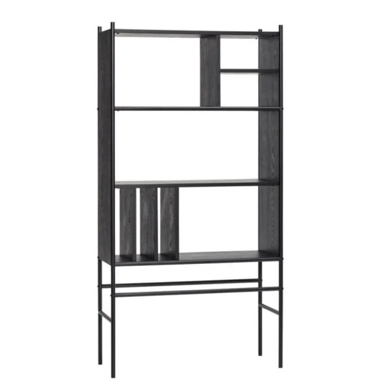 Mooi en handig rek van het Deense interieurmerk Hubsch. De kast heeft verschillende planken en vakken om spullen op te bergen. Gemaakt van metaal en hout. Afmeting 79x32xh160cm