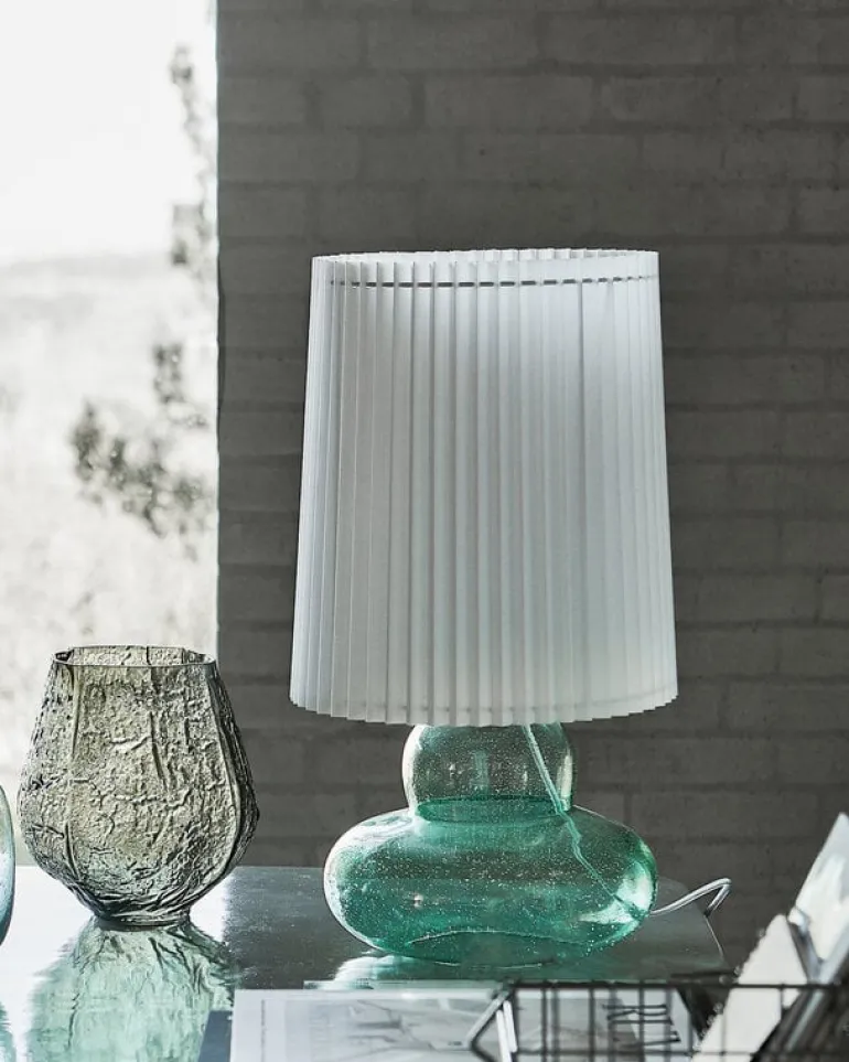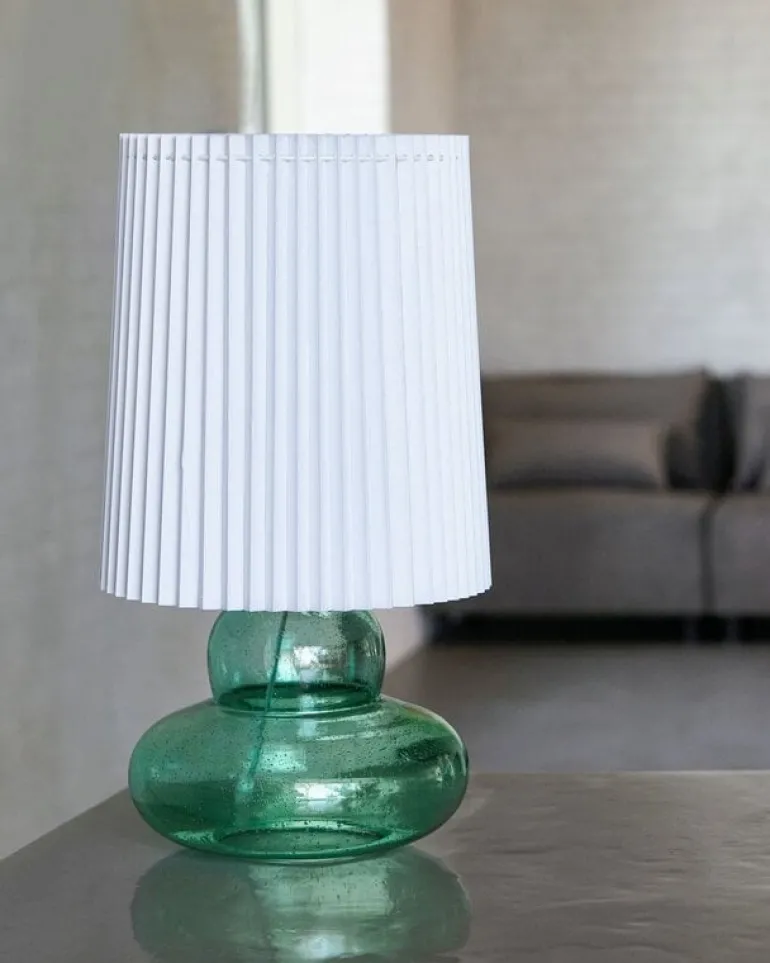 De Ribe tafellamp van House Doctor heeft een glazen voet gecombineerd met een geplooide lampenkap. Het glas is afgewerkt met luchtbellen waardoor het materiaal lichter lijkt! De House Doctor Ribe tafellamp heeft een afmeting van ø27,5x55cm