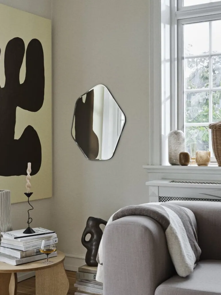 Prachtige spiegel met een organische vorm. De Broste Copenhagen spiegel valt door zijn design direct op in een ruimte. Beschikbaar in twee afmetingen. Afmeting 50×1,3x60cm