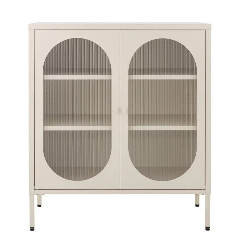 De Bloomingville Salvo kast is een prachtige metalen kast in een zachte zandkleur die elegantie toevoegt aan elke kamer. De twee deuren van de kast zijn voorzien van decoratieve details in geribbeld glas. Afmeting 80x90x40cm