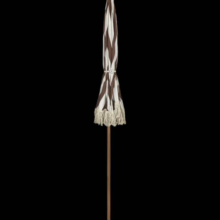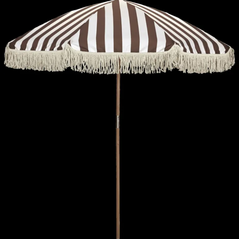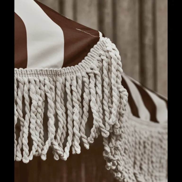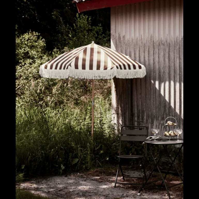 Geef je buitenruimte stijl en schaduw met de House Doctor Shade parasol. De brede, klassieke strepen in bruin en off-white gecombineerd met dikke off-white franjes zorgen voor een vintage uitstraling. Afmeting Ø190x230cm