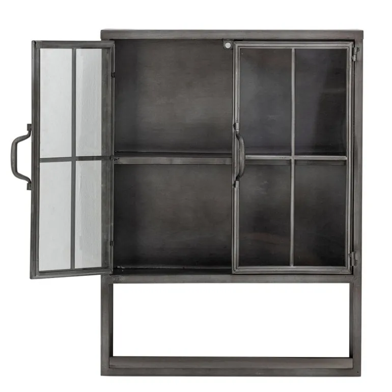 De Sindre Cabinet van Bloomingville is gemaakt van metaal met glazen ramen en zichtbare lasnaden, wat het een ruwe en industriële look geeft. De kast kan aan de muur worden gehangen of op de vloer worden geplaatst. Afmeting 46×21,5x61cm