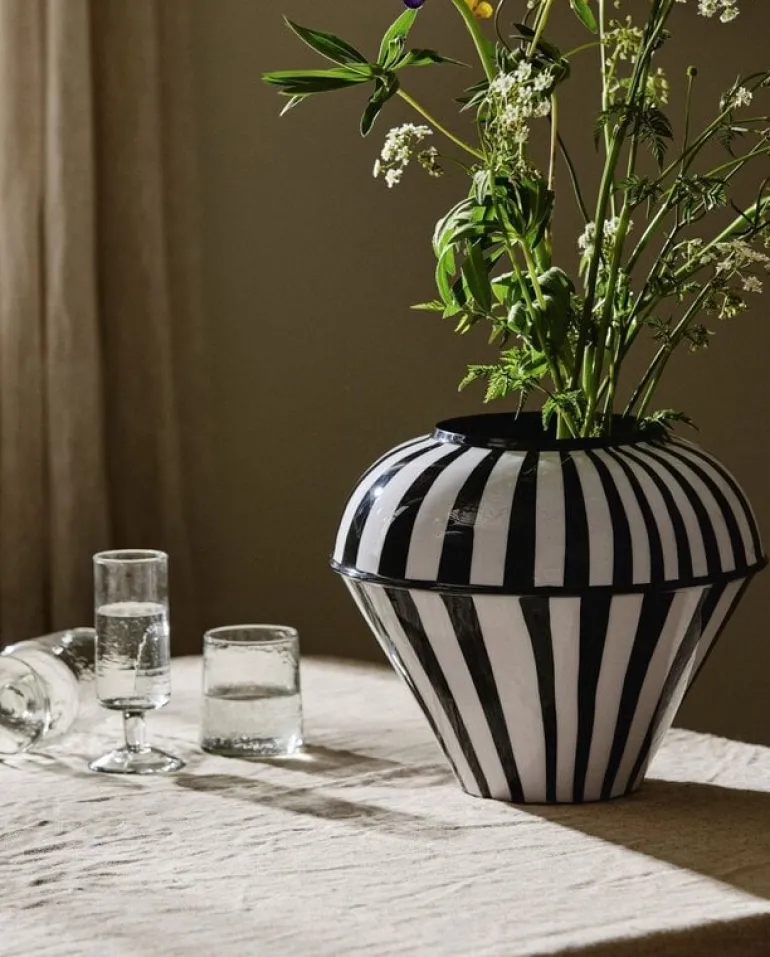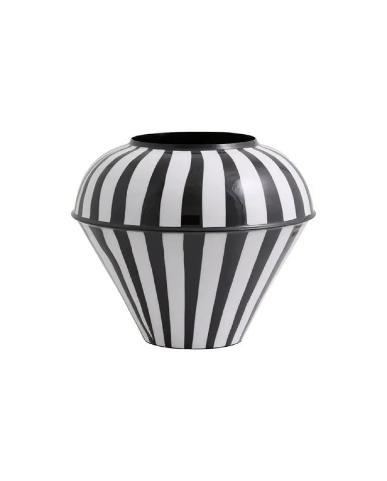 De Nordal Sipura vaas is gemaakt van ijzer en heeft een zwart/wit gestreept patroon. Afmeting Ø30x25cm