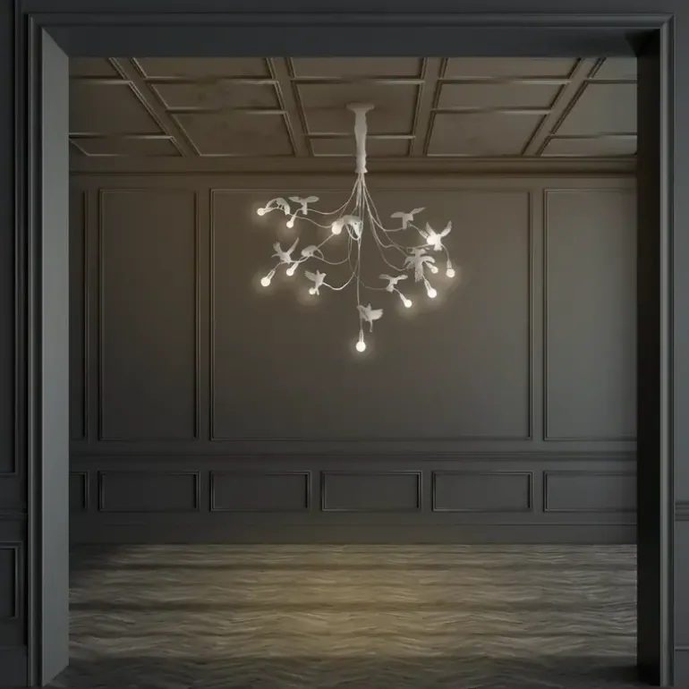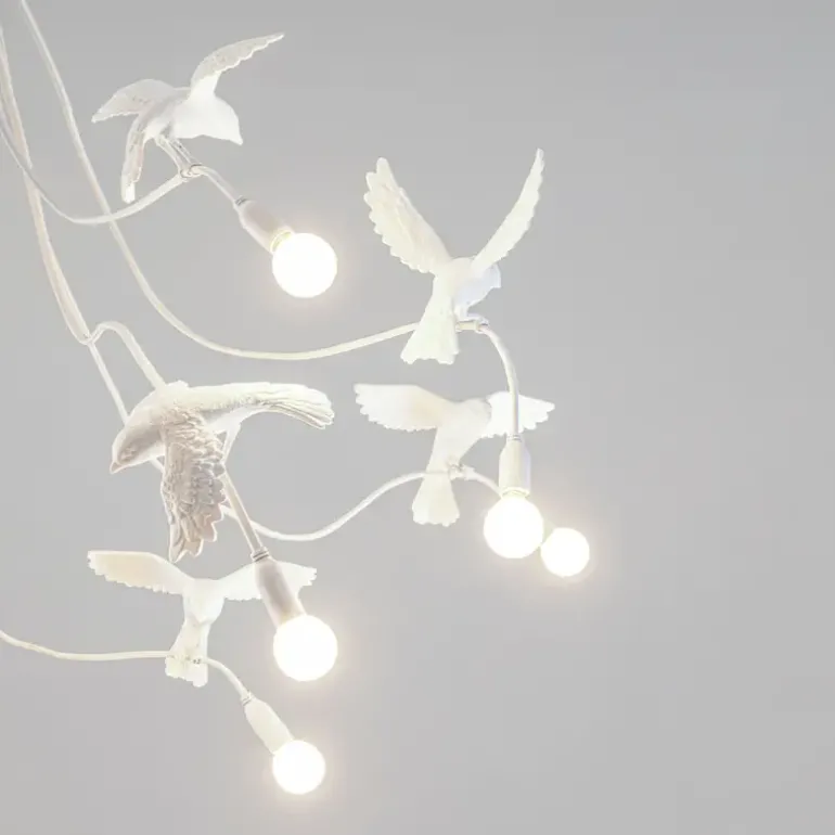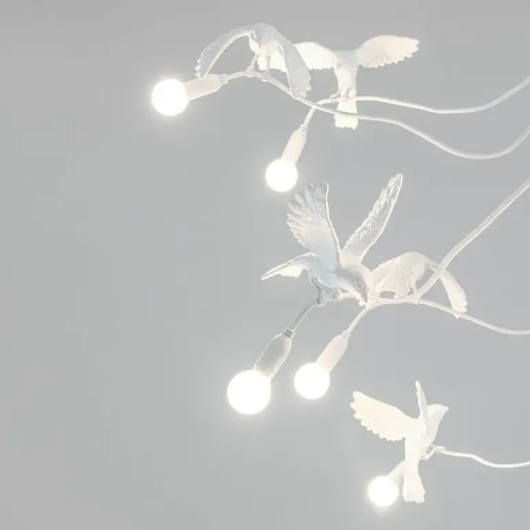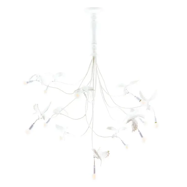 We zien de vitaliteit van deze vogels die levendig licht brengen. De Seletti Sparrow hanglamp is gemaakt van hars en er kunnen 12 lichtbollen in geplaatst worden. Afmeting 138x165x35,8cm