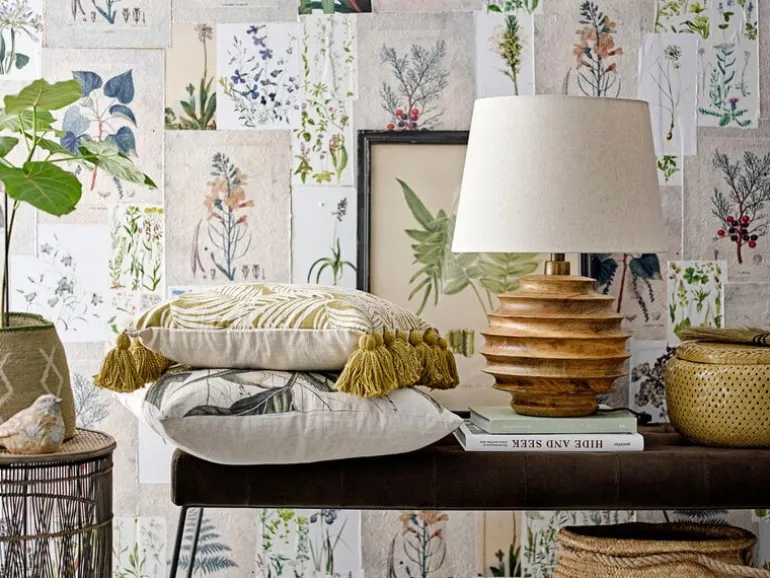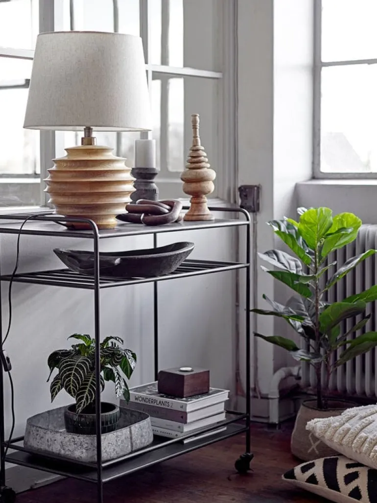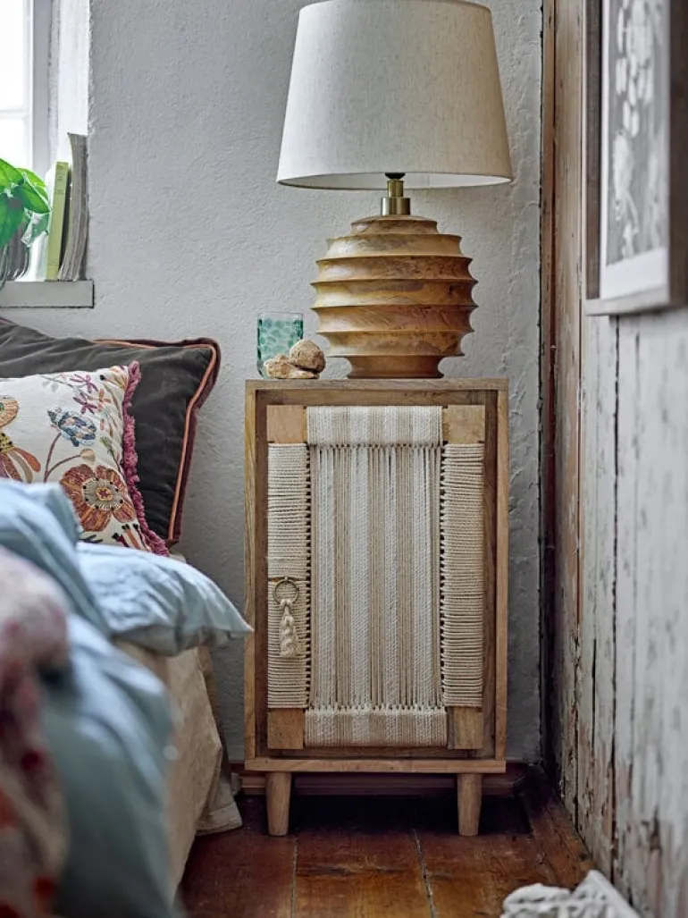 De Bloomingville Svale tafellamp valt op door het prachtige houtsnijwerk. De voet is gemaakt van mangohout en de kap van katoen. Afmeting Ø38,5x54cm