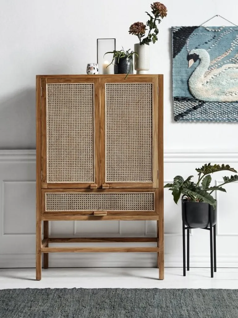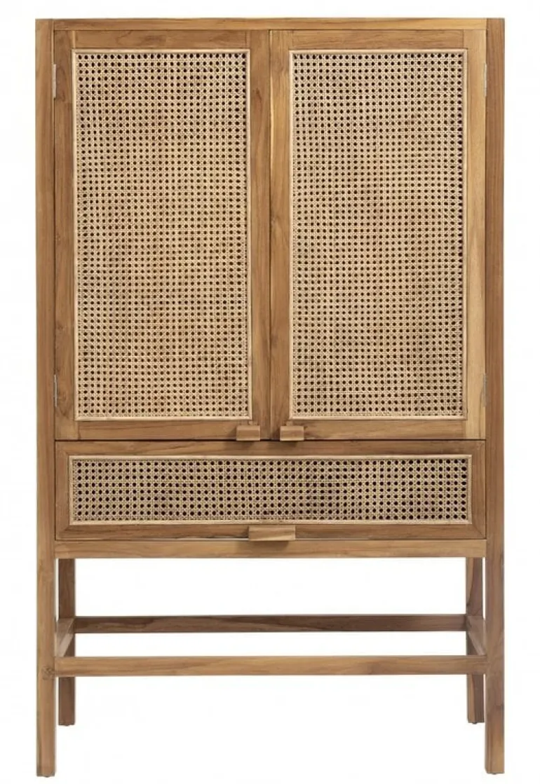 Mooie houten kast van het prachtige interieurmerk Nordal. Deze Nordal kast is gemaakt van teakhout met naturel webbing. De kast is 100 cm breed, 50 cm diep en 160 cm hoog. Voorzien van twee deuren en planken.