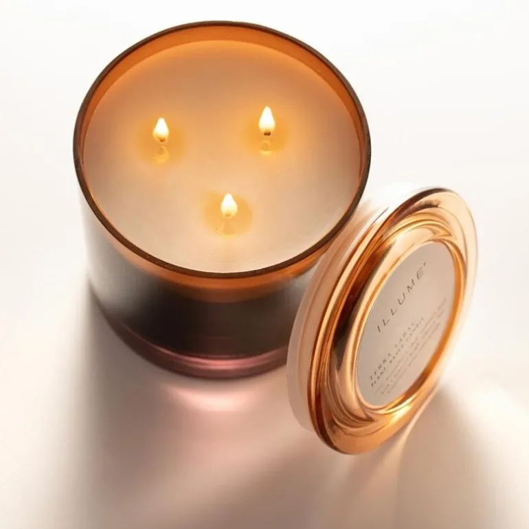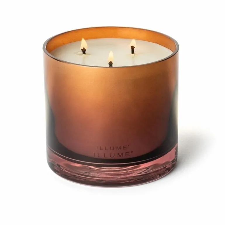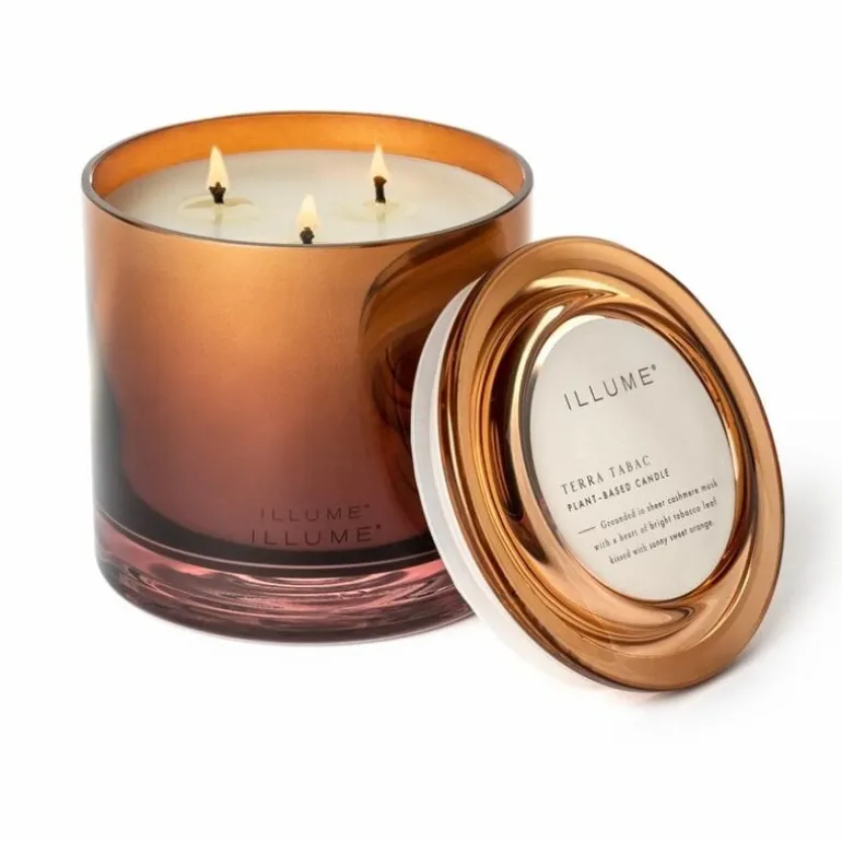 De Illume Terra tabac statement kaars met de geur van pure kasjmiermuskus, met een hart van helder tabaksblad en een vleugje zonnige, zoete sinaasappel. Vegan, dierproefvrij, plantaardig. Brandduur is tot 60 uur. Afmeting Ø11,5x12cm
