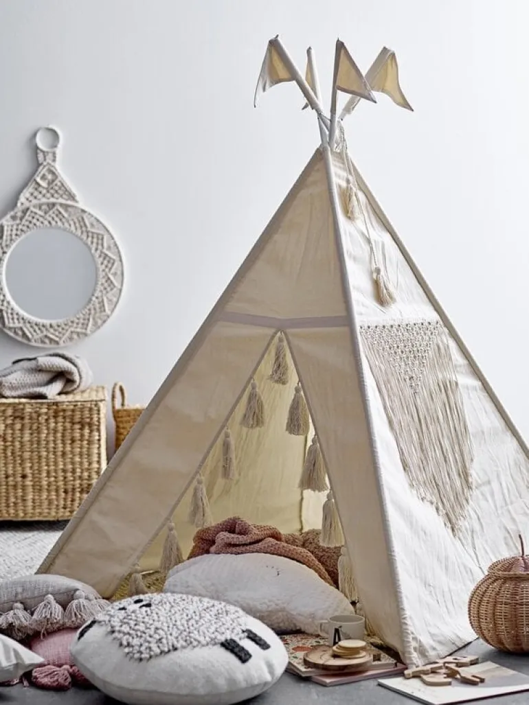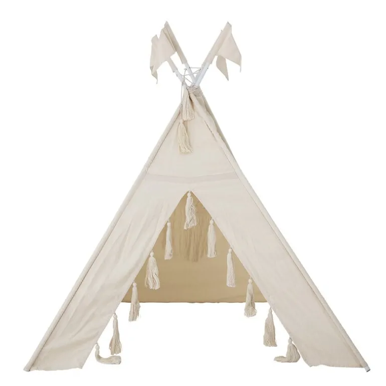 Mooie tipi van het prachtige merk Bloomingville Mini. Deze Bloomingville tipi is gemaakt van een naturel katoenen stof met ijzeren frame. Afmeting L110xH140xW110 cm