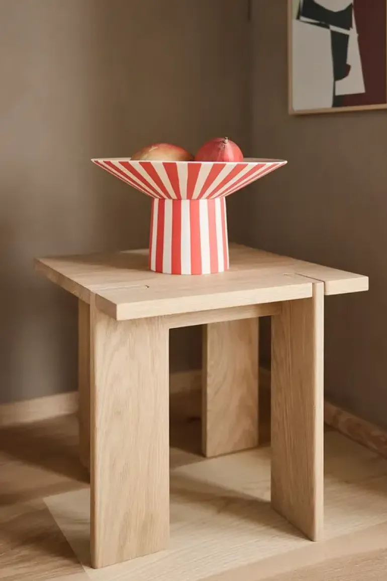 De OYOY Toppu centerpiece schaal met een vleugje kleur is een handbeschilderd, sculpturaal stuk dat een opvallende indruk maakt op elke tafel. Met zijn levendige strepen voegt hij een speelse touch toe aan elke ruimte. Afmeting 30x30x17cm
