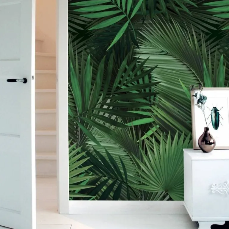 Een rol van het tropische Palm behang van KEK Amsterdam bestaat uit 2 verschillende banen met bladeren. De bladeren sluiten perfect op elkaar aan. Geef je interieur in no-time een tropische sfeer met ons behang met palmbladeren.