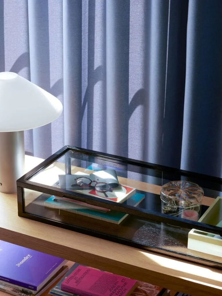 Prachtige displaybox van het interieurmerk Hubsch. De Hubsch View displaybox is gemaakt van mdf, glas, essenhout en essenfineer. Beschikbaar in twee formaten en kleuren. Afmeting 80x30x12cm