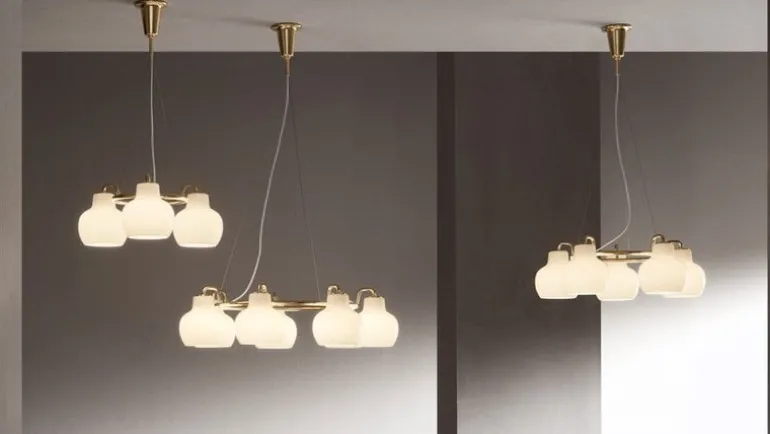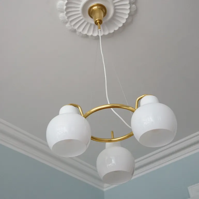 Materiaal: mondgeblazen wit opaalglas, gesatineerd gepolijst messing (onbehandeld)