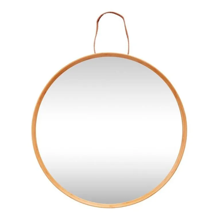 Moderne spiegel van het Deense interieurmerk Hübsch. Deze prachtige Hübsch wandspiegel is gemaakt van bamboe en heeft een leren lus om de spiegel op te hangen. De spiegel doorsnede is 60cm.