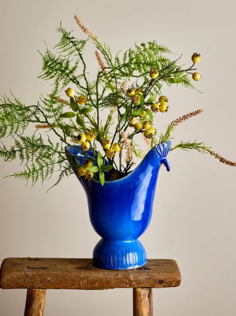 De Bloomingville Wylie vaas is een aardewerk vaas geïnspireerd op de pauw. De unieke vorm benadrukt het silhouet van de pauw, met bloemen, die als de vaas gevuld is, fungeren als de staart van de vogel. Afmeting 26x29x15cm