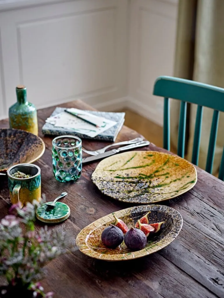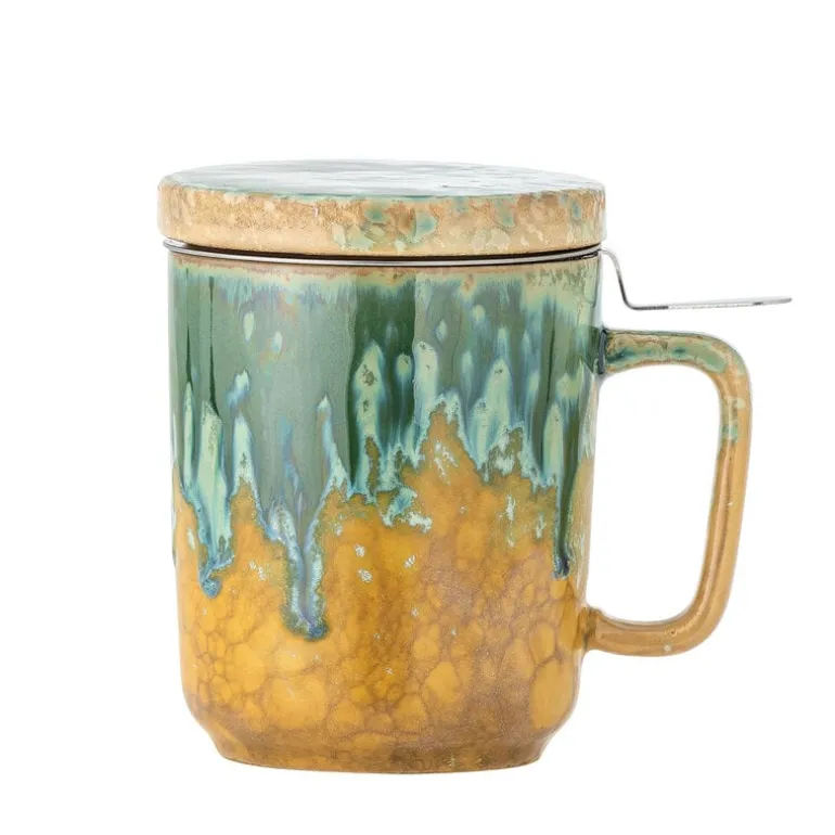 De Bloomingville Yuma mokken zijn van aardewerk gemaakt en een reactieve glazuur, waardoor elke mok uniek is. De meegeleverde deksel en infuser maken het gemakkelijk om je favoriete thee rechtstreeks in de mok te zetten. Afmeting Ø8×11,5cm