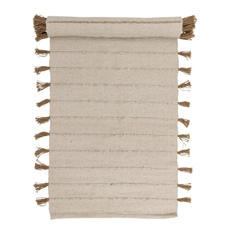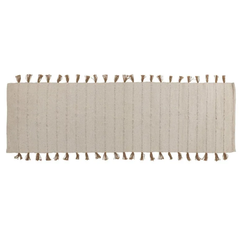 Het Bloomingville Avino vloerkleed is gemaakt van katoen en jute. Het vloerkleed heeft een eenvoudig ontwerp in ingetogen kleuren, met bruine franjes langs de zijkanten. Afmeting 245x75cm