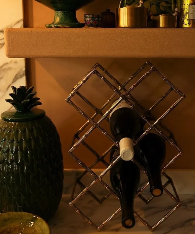 Prachtig wijnrek van het merk Doing Goods. Het Doing Goods Bodhi wijnrek is handgemaakt in India van gerecycled messing. Het messing heeft een mooi ‘bamboe’ patroon. Er passen maximaal 10 flessen in het wijnrek. Afmeting 43x29x15 cm
