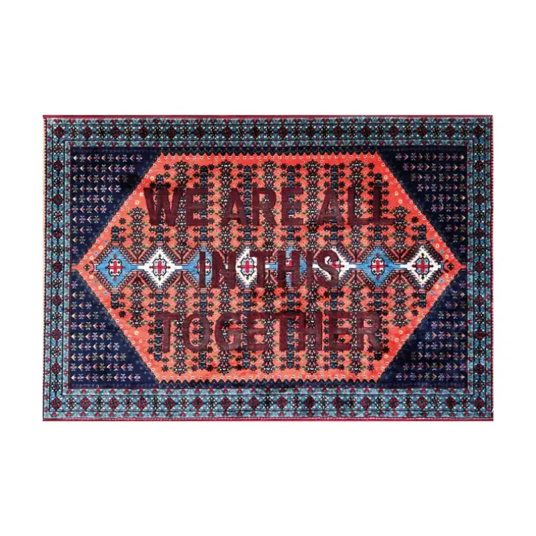 Kleurrijk vloerkleed van Seletti. Het Seletti Burnt vloerkleed together is gemaakt van polyester en op het kleed staat de tekst ‘We are all in this together’. Beschikbaar in verschillende uitvoeringen. Afmeting 180x120cm