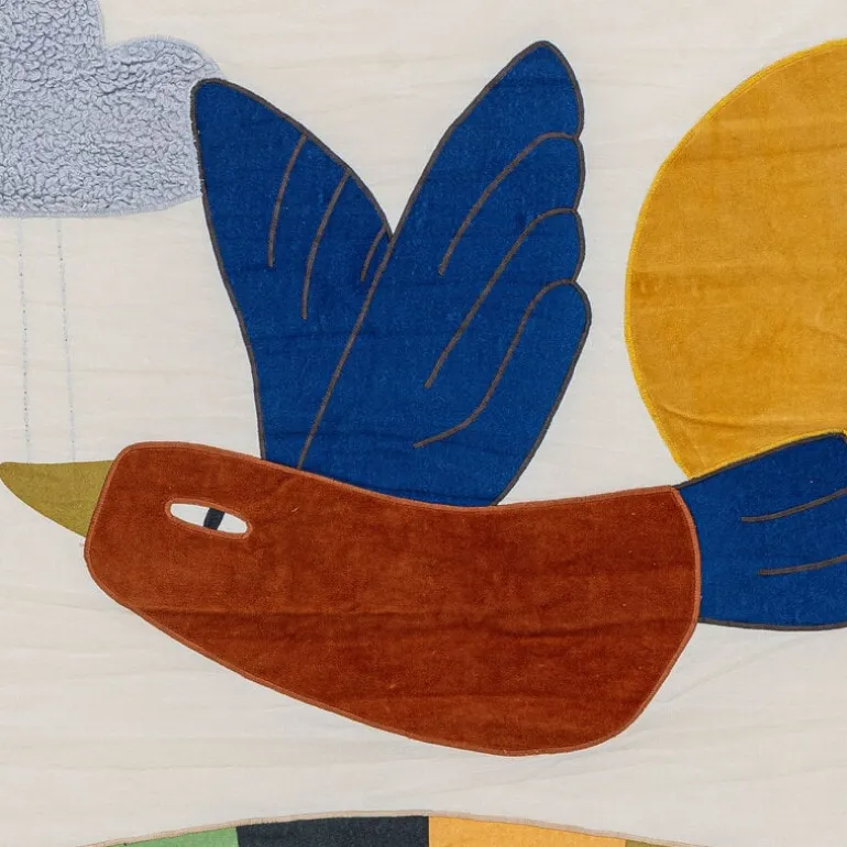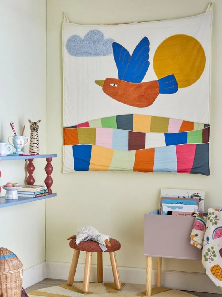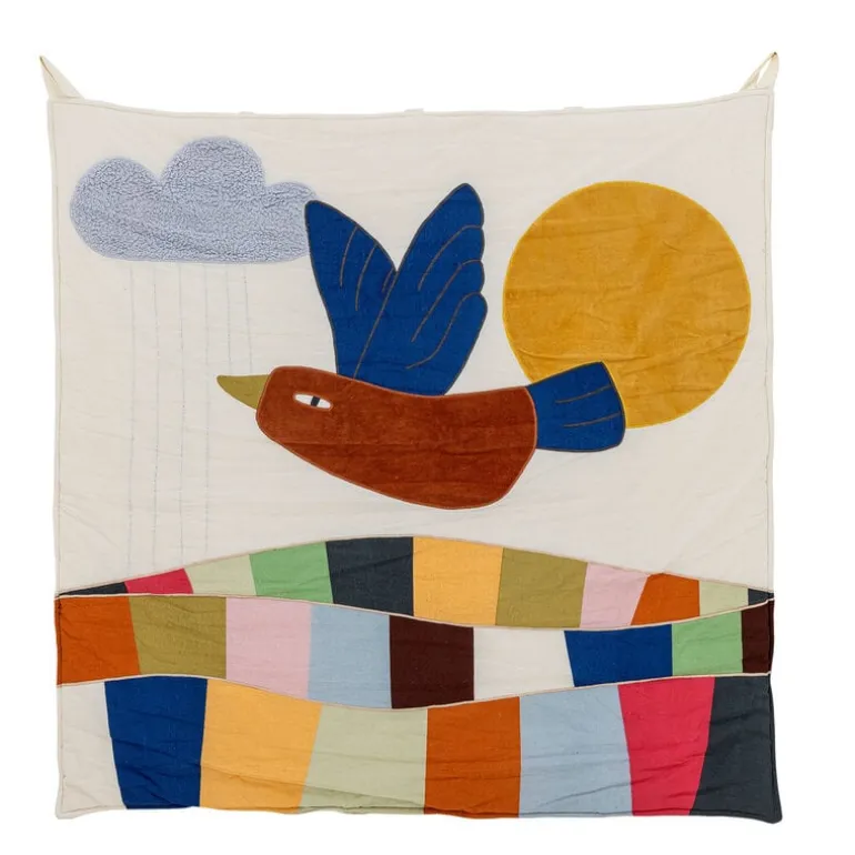 De Bloomingville Mini Colorine wanddecoratie is gemaakt van katoen en heeft een motief van een vogel die over een vredig landschap vliegt. Dit voegt warmte en persoonlijkheid toe aan de kinderkamer. Afmeting 101x101cm