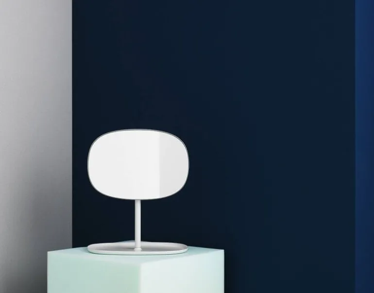 Handige Normann Copenhagen Flip spiegel. De Flip spiegel is ideaal te gebruiken omdat deze 360 graden draaibaar is. Het onderstel dient als schaal voor bijvoorbeeld sieraden of make-up. Past mooi in de minimalistische Scandinavische trend.